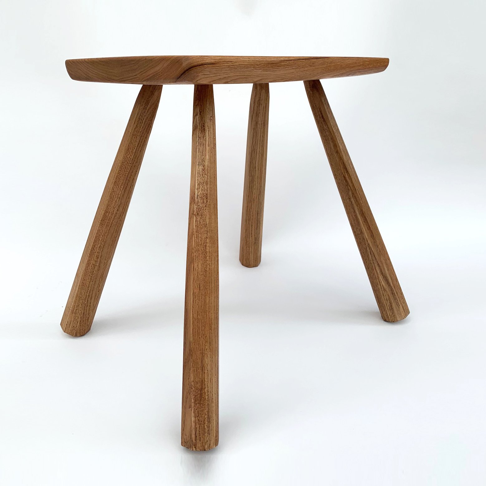 A four-legged hearthside stool made in the vernacular tradition from locally available timber foraged from hedgerows and woodlands. Made by hand with a variety of traditional hand tools, the seat is chestnut and the planed octagonal legs are ash. The stool is finished in linseed oil and beeswax.