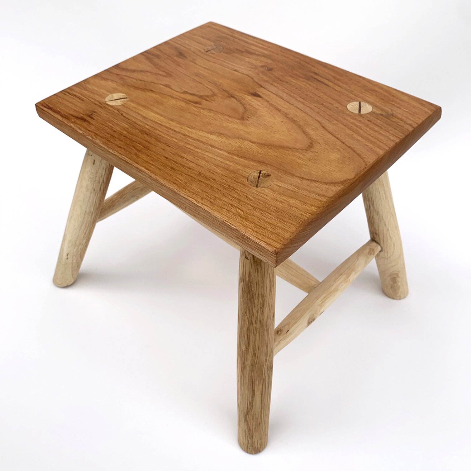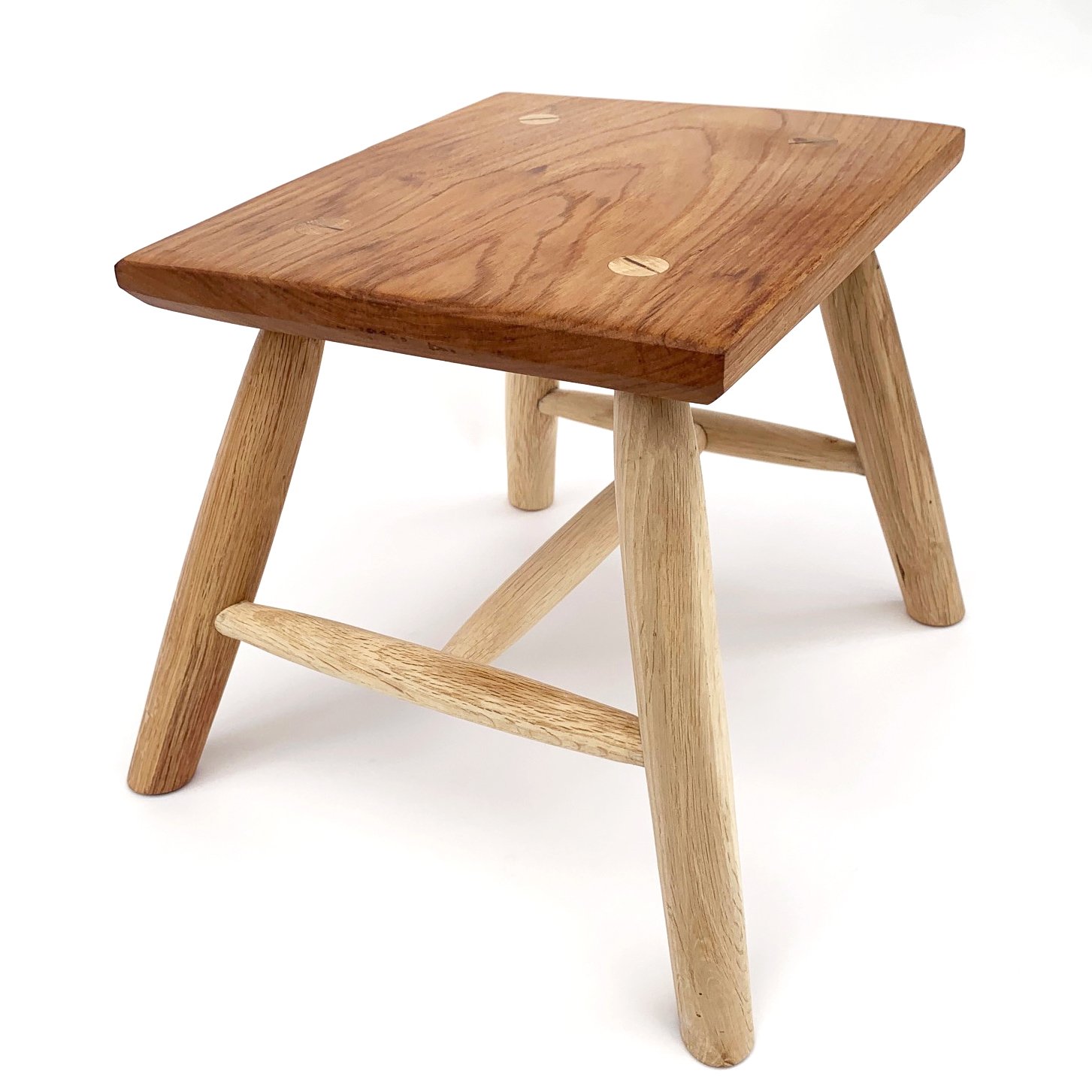 A four-legged fireside stool or cracket as they are know in the North East of England, made in the vernacular tradition from locally available timber foraged from hedgerows and woodlands. Made by hand with a variety of traditional hand tools, the seat is in chestnut and the legs are oak with oak stretchers. The stool is then finished in linseed oil and beeswax.