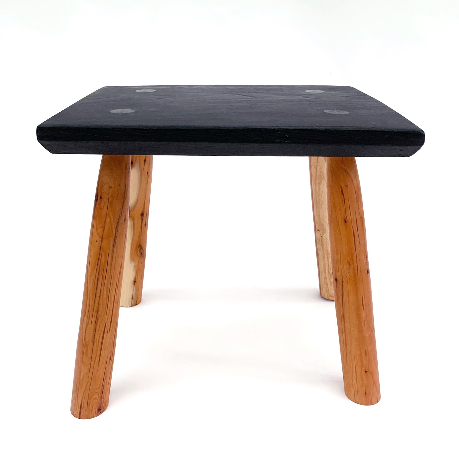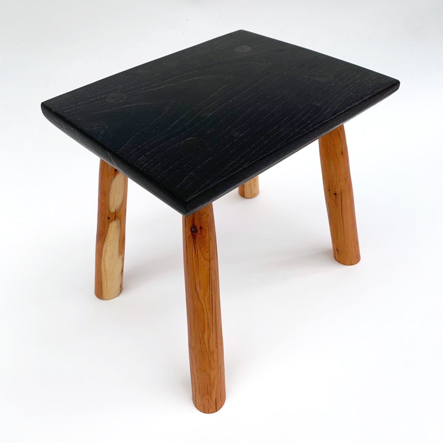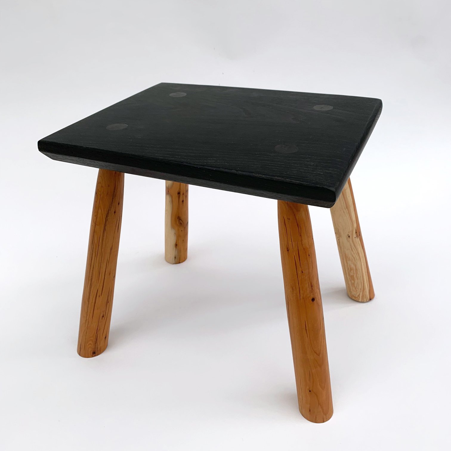 A four-legged hearthside stool or fireside cracket as they are know in the North East of England, made in the vernacular tradition from locally available timber foraged from hedgerows and woodlands. Made by hand with a variety of traditional hand tools, the seat is in chestnut and the legs are yew, the seat has been treated with iron mordent which reacts with the tannins in the wood and turns black. The stool is finished in linseed oil and beeswax.
